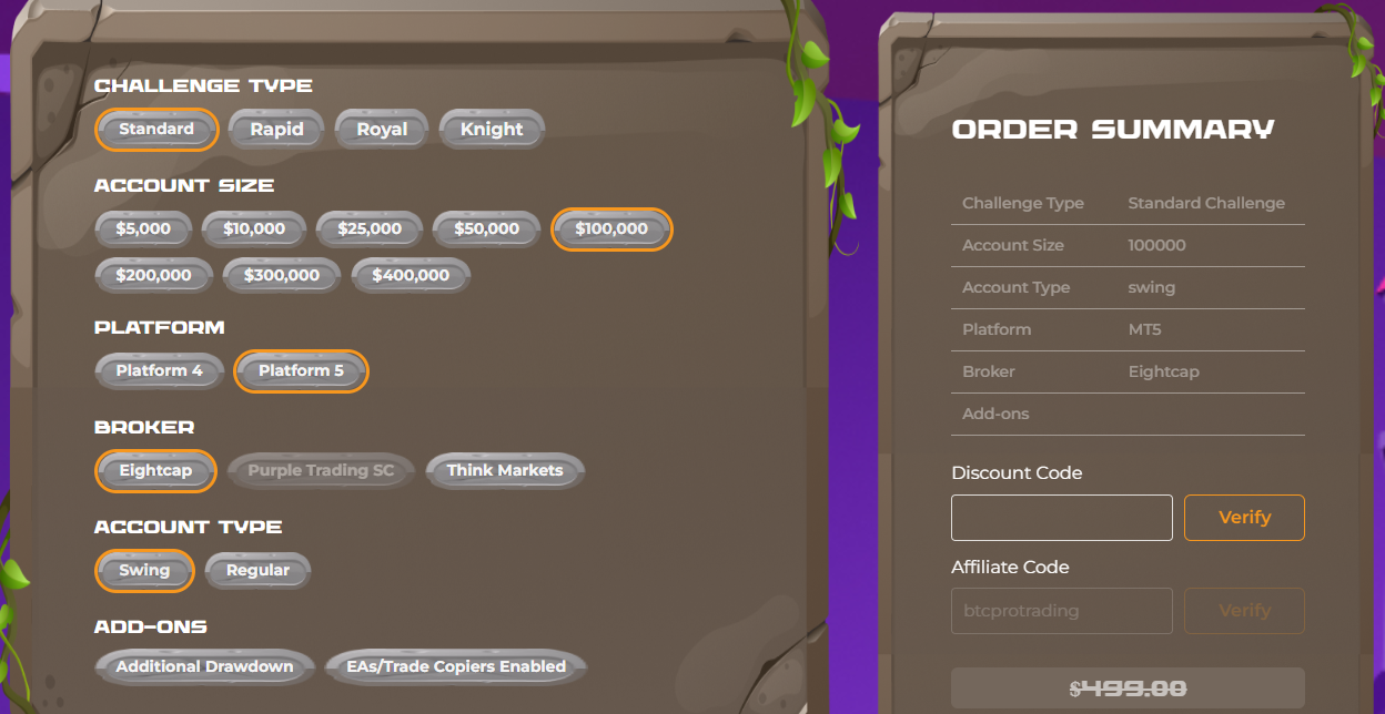 – Challenge Type: Standard, Rapid, Royal, Knight), sau đó chọn kích cỡ tài khoản. _ Nên chọn loại tài khoản Standard nhé.